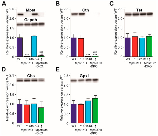 Hepatic expression of Mpst, Cth, Tst, Cbs, and Gpx1 in mice lacking Mpst, Cth, or both. Expression of Mpst (A), Cth (B), Tst (C), Cbs (D), and Gpx1 (E) in the livers of wild-type WT, Mpst (1st)-KO, Cth-KO, and Mpst (1st)/Cth-DKO mice was compared using Gapdh (A) as a loading control with that in WT liver as 1. Significant differences were observed versus WT mice at *** p < 0.001; Mpst (1st)-KO mice at ### p < 0.001; and Cth-KO mice at $$$ p < 0.001 (n = 3).