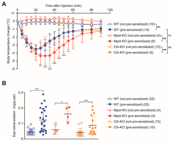 In this study, we analyzed, for the first time, the systemic anaphylactic responses in Cth-KO and Mpst-KO mice and found greater PSA (but not PCA) responses in Mpst-KO mice (Figure 5). In anaphylaxis, mast cells and macrophages secrete various inflammatory mediators including histamine, platelet-activating factor, and cysteinyl leukotrienes; thereby eliciting vasodilation and increased vascular permeability which leads to hypothermia [35,36]. Passive anaphylactic responses originate from mast cells that are pre-sensitized with antigen-specific IgE antibodies [33]. Because vascular permeability levels (in PCA assay) were equivalent between Mpst-KO and WT mice, enhanced hypothermic responses (in PSA assay) are likely caused by abnormal vasodilation and autonomous thermoregulation rather than mast cell responses. A recent study demonstrated that the administration of propargylglycine into mice, a non-specific inhibitor of Cth, interferes with LPS (lipopolysaccharide)-induced and brown adipose tissue-mediated thermogenesis [37]; suggesting a possible role for H2S/RSS in general thermoregulation. Further studies are necessary to delineate the roles of Mpst/Cth and produced H2S/RSS in the thermoregulation.