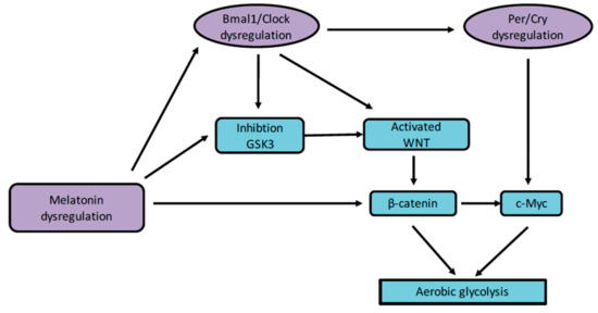 CRs and aerobic glycolysis. The dysregulation of melatonin and circadian clock genes leads to the activation of WNT and inactivation of GSK3. The WNT pathway enhances β-catenin accumulation and then, its nuclear translocation. Activation of the β-catenin pathway leads to aerobic glycolysis. Abbreviations: circadian locomotor output cycles kaput (Clock), brain and muscle aryl-hydrocarbon receptor nuclear translocator-like 1 (Bmal1), period (Per), cryptochrome (Cry), glycogen synthase kinase-3β (GSK-3β).