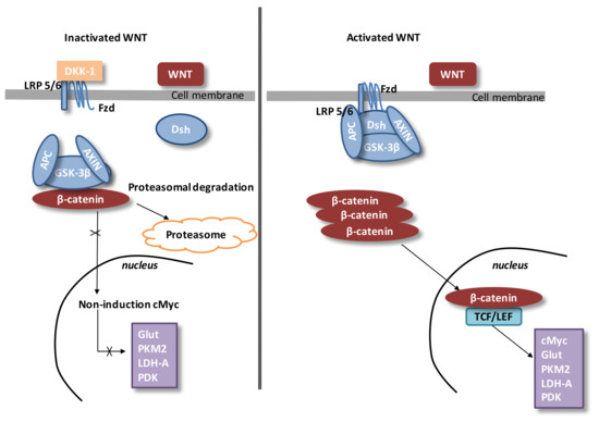 Numerous studies have observed that the WNT/β-catenin pathway can downregulate pyruvate oxidation in the TCA cycle [20,171]. The WNT/β-catenin pathway, by activating both the PI3K/Akt/mTOR pathway and HIF-1α, can lead to aerobic glycolysis [171,172]. The PI3K/Akt pathway controls β-catenin accumulation [173]. c-Myc directly stimulates HIF-1α [174], PDK, and lactate transporter (MCT-1) expression [171]. The stimulation of HIF-1α leads to the overexpression of glucose transporters (Glut), hexokinase (HK), pyruvate kinase (PK), PDK1, and LDH-A [175,176,177,178].