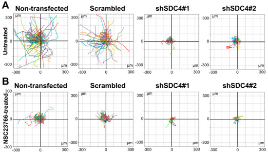 The representative wind rose plots depicting the migratory tracks of the individual cells show the decreased motility of all cell lines upon treatment with the Rac1 inhibitor NSC23766 (Figure 2B). The representative plots clearly show the result of the combined effect of syndecan-4 silencing and Rac1 inhibition. Notably, the migratory parameters of syndecan-4 silenced cell lines further decreased following NSC23766 treatment.