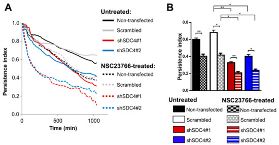 The effectiveness of cell migration depends on two essential features: cell-speed and directional persistence. At the cellular level, directional persistence depends on the tenacity of lamellipodial protrusions and the stability of the trailing edge [27,28]. To ascertain the stability of the orientation of the cell migration, we also calculated the persistence index [29] in the case of the control and the syndecan-4 knockdown cell lines. The values of the persistence index over the timescale represent the time-dependency of the directional persistence showing that these differences can be constantly observed by comparing the cell lines (Figure 3A).