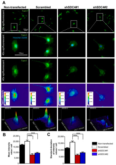 Tiam1 (T-lymphoma invasion and metastasis-1) expression of the different cell lines. (A) Representative images show Tiam1 (green) distribution. The non-transfected and scrambled cells exhibit an asymmetric, polarized Tiam1 arrangement, which is absent due to SDC4 silencing. Nuclei are blue (Hoechst 33258). Representative pseudocolor images (2D and 3D) depict Tiam1 signal intensity. The color was assigned to each pixel based on the pixel intensity value according to the calibration bar (shown on left-hand sides of the images). The mean intensity values in the individual cells are quantified in (B), and the average standard deviation values of the Tiam1 intensities are depicted in (C); n = 4–20 cells/cell line were analyzed; data are reported as mean+ SEM; **** p < 0.0001.