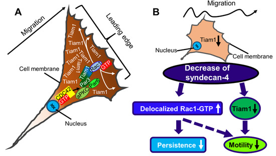 (A) Schematic representation of a migrating cell with a characteristic shape. The direction of migration is well defined, and the Tiam1 is asymmetrically accumulated at the leading edge resulting in Rac1 activation and lamellipodia formation. (B) Knocking-down of syndecan-4 resulted in decreased Tiam1 expression, abrogated the asymmetrical distribution of Tiam1, decreased the directional persistence of the movement, and decreased cell motility. Par3, Par6: Partitioning defective 3,6; aPKC: atypical PKC; Tiam1: T-lymphoma invasion and metastasis-1;