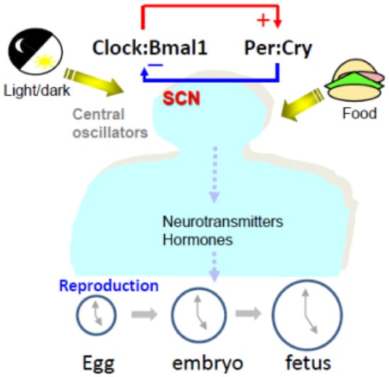 - Boden, M.J.; Varcoe, T.J.; Kennaway, D.J. Circadian regulation of reproduction: From gamete to offspring. Prog. Biophys. Mol. Biol. 2013, 113, 387–397. [Google Scholar]