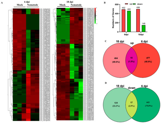 Differentially expressed genes (DEGs) induced by root-knot nematodes at 6 and 18 dpi. (A) Cluster heat map showing the level of expression of differential genes; (B) Up- and downregulated genes; (C) Venn diagrams showing intersection of genes that were upregulated at either 6 or 18 dpi; (D) Venn diagrams showing intersection of genes that were downregulated at either 6 or 18 dpi.