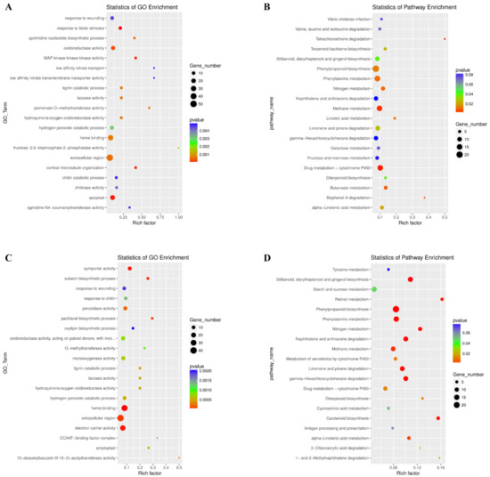 The 20 most enriched Gene Ontology (GO) terms (A and C) and Kyoto Encyclopedia of Genes and Genomes (KEGG) pathways (B and D) for Nipponbare rice roots infected by Meloidogyne incognita at 6 dpi (A and B) and 18 dpi (C and D). “Rich factor” indicates the ratio between the number of DEGs and the number of genes in this pathway. The higher the rich factor, the greater the degree of enrichment.