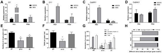 Altered disease resistance of bri-D and d2 plants against RKNs. (A–D) D2, D11, OsBRI1, and OsBAK1 expression. Error bars indicate the SD between biological replicates (n = 3). (E) Numbers of second-stage infective juveniles (J2) inside the roots of Bir-D and d2 mutants at 6 d after RKN inoculation (SD, n = 16). (F) Numbers of root galls on the Bir-D and d2 mutants at 18 d after RKN inoculation (SD, n = 16). (G,H) Numbers and percentages of different larval instars on the Bir-D and d2 mutant sat 18 d after RKN inoculation (SD, n = 16); * p < 0.05, ** p < 0.01.