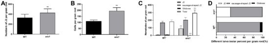 Further examination revealed that the total number of nematodes was higher in the ers1 mutant than in the wild-type control. Among them, more numerous J2 populations and fewer globose RKN were found in ers1 compared with wild-type roots. In addition, ers1 and wild-type roots contained a similar number of sausage-shaped J2 (Figure 7C). Further analysis showed that the proportion of J2 was significantly higher and that of sausage-shaped J2 and globose RKN was significantly lower in ers1 roots compared with wild-type roots at 18 dpi (Figure 7D).