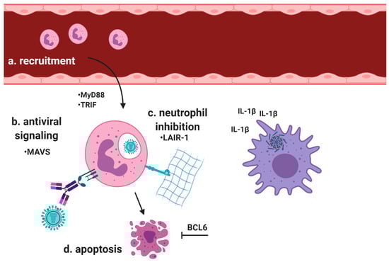 While neutrophil adaptations in response to influenza infection are some of the best-studied, important findings with other viruses are continuing to direct much-needed focus toward the innate immune response to viral infections (Figure 2). It was recently demonstrated in a mouse model of respiratory syncytial virus (RSV) infection that while signaling through myeloid differentiation primary response 88 (MyD88) and TIR-domain-containing adapter-inducing interferon-β (TRIF) is essential for neutrophil recruitment to the lung, signaling through mitochondrial antiviral-signaling protein (MAVS) is required for neutrophil activation and the production of key mediators including matrix metalloproteinase 9 (MMP-9), MPO, and NE [91]. RSV infection is associated with severe neutrophilic inflammation, sometimes contributing to mortality [92]. Resolving neutrophilic inflammation is therefore as important as suppressing the infection, and a recent report suggests that leukocyte-associated Ig-like receptor 1 (LAIR-1) fills this role during RSV infection. This receptor is not expressed on circulating neutrophils, but may be upregulated upon migration into tissues and subsequent activation [26]. RSV-infected mice lacking functional LAIR-1 exhibited greater neutrophil influx into the airways but had no indication of enhanced viral clearance [27].