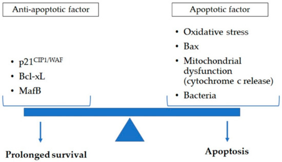 Apoptosis in lung macrophage is determined by a variety of apoptotic (oxidative stress, Bax, and mitochondrial dysfunction such as cytochrome c release) and anti-apoptotic (p21CIP1/WAF, Bcl-xL, and MafB) factors. Exposure to cigarette smoke and pathogens impact this balance of anti-apoptotic and apoptotic factors. This could contribute to reduced clearance of dead cell and cell debri augmenting the chronic inflammatory response in lung tissues of chronic obstructive pulmonary disease subjects. Bax: B-cell lymphoma protein 2-associated X; Bcl-xL: B-cell lymphoma-extra large; MafB: v-maf avian musculoaponeurotic fibrosarcoma oncogene homolog B.