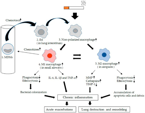 Lung macrophage (LM) kinetics and phenotypes in chronic obstructive pulmonary disease (COPD): 1. Blood monocyte-derived macrophages (MDMs) migrate into small airways and airspaces and this migration is activated by chemokines such as CCL2 or monocyte chemoattractant protein-1 (MIP-1) [69], CXCL9, CXCL10, CXCL11, and CCL5 (RANTES) [66]. 2. Interstitial macrophages (IMs). MDMs are recruited to the lung interstitium and differentiate into IMs [49]. 3. Non-polarized macrophages. IMs recruited into both small airways and larger airspaces are initially non-polarized and are polarized to either M1 macrophages or M2 macrophages dependent on the microenvironment [12]. 4. M1 macrophages. They secrete pro-inflammatory cytokines such as IL-6, IL-1β and TNF-α [76,77,78,79], which could damage lung tissues if secreted in excess. In COPD, phagocytosis and efferocytosis of microorganisms of M1 macrophages is impaired [24,106,108,109,110,111,112], which may lead to bacterial colonization. 5. M2 macrophages or alternative acitivated macrophages are involved in the resolution of inflammation and tissue repair. In COPD, they produce MMPs (MMP-2, 9, and 12) [52,57] and cathepsins (cathepsins K, L, and S) [58] as proteases and release significantly less of the tissue inhibitor of metalloproteinase (TIMP)-1 as a anti-elastolytic molecule [52,87], which could induce tissues damage and amplify the inflammatory response contributing to tissue destruction. Phagocytosis and efferocytosis of cell debris and apoptotic cells are also impaired [105,113,114,115,116,117,118]. These apoptotic cells which are not eliminated undergo secondary necrosis with further release of inflammatory mediators that decrease efferocytosis, causing a vicious cycle [124]. The chronic inflammatory process further increases during acute exacerbations and is associated with a poor long-term outcome [5].