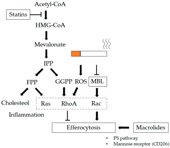 The 3-hydroxy-3-methylglutaryl coenzyme A (HMG-CoA) reductase inhibitors, or statins, are commonly used as cholesterol-lowering drugs and reduce the blood concentration of inflammatory cytokines in addition to lowering cholesterol levels in the blood [187,188,189]. They also have anti-inflammatory, anti-oxidant, anti-thrombogenic, and vascular function-restoring actions [190] and decrease mortality from cardiovascular disease [191]. Alexeeff and co-workers showed statin use in patients with COPD results in a reduced decline in FEV1 over time compared to non-users (FEV1 of 23.9 mL/year in non-users vs. 10.9 mL/year in statin users) [188]. Additionally, statins have been shown to reduce mortality in COPD patients [192,193]. The postulated reasons for this beneficial effect of statins in COPD are their anti-inflammatory properties [194,195,196], their antioxidant capacity [197], and their potentiation of efferocytosis in LMs [198]. In LMs, the regulation of efferocytosis is controlled by the Ras homolog family member (Rho) family guanosine triphosphatases (GTPases) such as RhoA [99,199,200] and Rac-1/cell division control protein 42 homolog (CDC42)/RhoG [201,202]. Statins regulate prenylation of Rho-GTPases, with blocking of HMG-CoA reductase decreasing the production of mevalonate and downstream prenylation substrates such as farnesyl pyrophosphate (FPP) and geranylgeranyl pyrophosphate (GGPP) (Figure 3). Lovastatin increased efferocytosis in the murine lung and ex vivo LMs from COPD patients in a HMG-CoA reductase-dependent manner. These findings show that statins enhance efferocytosis via RhoA inhibition in vitro and in vivo [198]. CS and other oxidant stressors, suppress efferocytosis via activating RhoA [203], and antioxidant therapy reduces these effects [197]. In addition, statins increase the production of peroxisome proliferator-activated receptor gamma (PPARγ), which also increases efferocytosis of LMs [204]. CS exposure induces an increase in the production of MMP-9 in LMs isolated from COPD patients compared to those from normal volunteers or healthy smokers [52]. The statin, Lovastatin, suppresses MMP-9 from CSE mouse peritoneal macrophages (MPMs) and human monocyte-derived macrophages (HMs) [205]. This reduction in CSE-induced MMP-9 production in LMs is mediated via inhibition of RAS activation, subsequently downstream Raf-MEK, ERK or PI3K-Akt activation, and AP-1 and NF-κB stimulation [206]. Together, these studies demonstrate the anti-inflammatory properties of statins and the potential benefit in attenuating the chronic LM-mediated inflammatory response in COPD (Figure 4).
