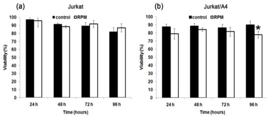 The effect of random positioning machine (RPM)-simulated microgravity on cell viability of Jurkat (a), and Jurkat/A4 cells (b). Cell viability was evaluated with a trypan blue exclusion assay. The results are expressed as means ± standard deviations. * p < 0.05, as compared with the static controls (n = 7).