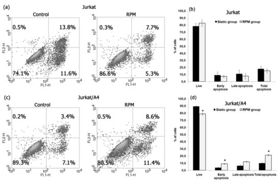 Apoptosis in Jurkat and Jurkat/A4 cells under simulated microgravity (96 h). Cells were stained with annexin V, conjugated, and evaluated for apoptosis as described in the Materials and Methods section. (a,c) Flow cytometric analysis of cells to assess apoptosis using annexin V labelling. Results are shown as percentages of viable cells (annexin V−/propidium-iodide (PI)−), early apoptotic cells (annexin V+/PI−), late apoptotic cells (annexin V+/PI+), and dead cells (annexin V−/PI+). The apoptosis rates were statistically evaluated. (b,d) Quantitative comparison of apoptosis between the static control and RPM groups. The results are expressed as means ± standard deviations. *p < 0.05, as compared with the static controls (n = 3).