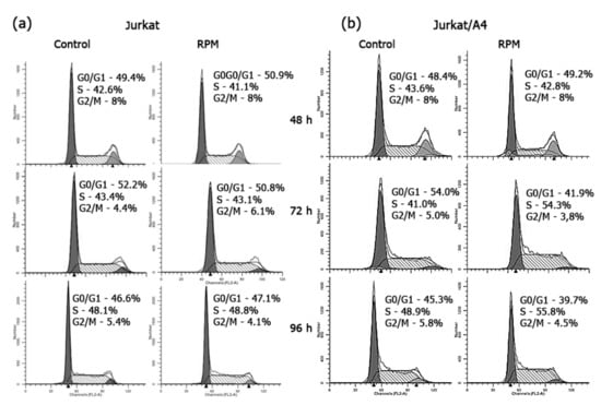 However, exposure of malignant glioma cells to simulated microgravity for 3 days did not cause cell-cycle arrest or a change between the control and clinostat groups [34]. In our earlier study, we reported that simulated microgravity inhibited proliferation, induced apoptosis, and changed the morphology of MEG-01 megakaryoblastic cells [35]. In the present study, we demonstrated that the percentage of Jurkat/A4 cells in the G0/G1-phase decreased after 72 and 96 h. At the same time, the percentage of cells in the S-phase increased in the RPM group in comparison with in the static control group. These data indicate that microgravity inhibits the cell-cycle progression of human multidrug-resistant Jurkat/A4 cells.