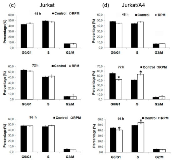Effects of RPM-simulated microgravity on the cell cycle of Jurkat (a) and Jurkat/A4 cells (b). Cell cycle measurements were performed as described in the Materials and Methods section. Representative histograms are shown. Data are presented as a histogram, with cell number (y-axis) plotted against DNA content (x-axis). The first peak contains cells with diploid DNA in the G0/G1-phase. The cells in the second peak, with double PI-fluorescence intensity, were tetraploid in the G2-phase. The area between the two peaks represents cells in the S-phase. The number of cells gated in the G0/G1-, S-, or G2-phases is presented as a percentage of total cells (%). (c,d) Quantitative comparison of apoptosis between the static control and RPM groups of Jurkat and Jurkat/A4 cells. Percentages of populations in each cell cycle were averaged from five parallel experiments (at each time point). The results are expressed as means ± standard deviations. * p < 0.05, as compared with the static controls (n = 5).