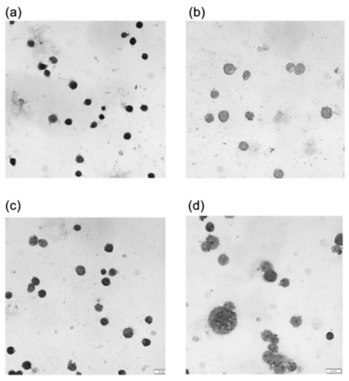 Simulated microgravity had no significant effect on the morphology of either Jurkat or Jurkat/A4 cells after 24 or 72 h, demonstrating that cells grown under static culture conditions and under microgravity conditions show the typical morphology of Jurkat cells. However, after 96 h of RPM exposure, the size and shape of the majority of Jurkat/A4 cells had changed relative to the static control group cells (Figure 5).