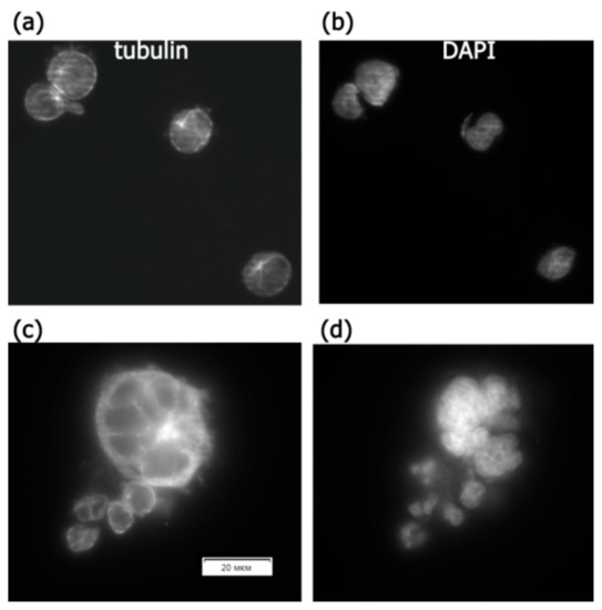 For immunostaining, the cells were washed in PBS, fixed in 4% paraformaldehyde for 10 min, and permeabilized with 0.5% saponin for 15 min according to the antibody protocol. After washing with PBS, the cells were incubated in blocking buffer (10% FBS) for two hours. Following a further wash with PBS, the cells were incubated with anti-beta-tubulin (1:1000 dilution; Abcam, Cambridge, United Kingdom) overnight at 4 °C. The cells were washed three times with PBS and incubated for 15 min with 4′,6-diamidino-2-phenylindole (DAPI) at RT. Then, the cells were washed three times with PBS and mounted on glass slides using a mounting medium (Thermo Fisher, Scientific, Denmark). Fluorescence was visualized using a BX51 microscope equipped with an Olympus DP71 camera, 60/1.35 oil Apolens, and the cellSens version 2.1 image analysis program (all Olympus, Tokyo, Japan).