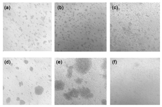 Bright-field images of Jurkat cells and Jurkat/A4 cells using the Carl Zeiss Axiovert 40 CFL microscope (Carl Zeiss AG, Oberkochen, Germany) at ×100 magnification. Jurkat cells are shown (a) before seeding in the flask, (b) as static controls (96 h), and (c) in the RPM group (96 h). Jurkat/A4 cells are shown (d) before seeding in the flask, (e) as static controls (96 h), and (f) in the RPM group (96 h).