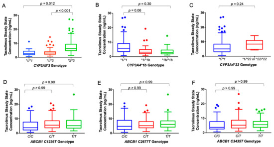 The associations between CYP3A4/5 SNPs and median steady-state tacrolimus trough concentrations were significant (Table 2). Specifically, CYP3A5*1/*1 patients had significantly lower median steady-state tacrolimus trough concentrations than CYP3A5*3/*3 patients (2.8 [range, 0.6–11.2] vs. 6.2 [1.3–27.1] ng/mL; p = 0.002). CYP3A5*1/*3 patients had significantly lower median tacrolimus trough concentrations than CYP3A5*3/*3 patients (3.0 [0.8–14.4] vs. 6.2 [1.3–27.1] ng/mL; p < 0.001) (Figure 2A, Table 2). After adjusting for multiple comparisons, both associations remained significant (p = 0.012 and p < 0.01, respectively). CYP3A4*1b/*1b patients trended toward lower median steady-state tacrolimus trough concentrations when compared to CYP3A4*1/*1 patients (2.8 [1.1–14.4] vs. 5.8 [0.8–27.1] ng/mL; p = 0.05), and CYP3A4*1/*1b patients had significantly lower trough concentrations than CYP3A4*1/*1 patients (3.1 [0.6–19.3] vs. 5.8 [0.8–27.1] ng/mL; p = 0.01) (Figure 2B, Table 2). However, the association between CYP3A4*1/*1b and CYP3A4*1/*1 patients was no longer significant after adjusting for the multiple comparisons. Significant differences in median steady-state tacrolimus trough concentrations were observed between CYP3A4*1/*1 patients and patients who harbored at least one CYP3A4*22 allele (5.1 [0.6–27.1] vs. 8.4 [4.3–14.3] ng/mL; p = 0.04) (Figure 2C, Table 2). However, again, this association was no longer significant after adjusting for the multiple comparisons. No significant differences were detected between all three ABCB1 SNPs and the median tacrolimus trough concentration (p > 0.05) (Figure 2E,F, and Table 2). Last, no significant differences were detected between the severity of potential drug-drug interactions and median tacrolimus trough concentration (p > 0.05) (Supplementary Table S4).