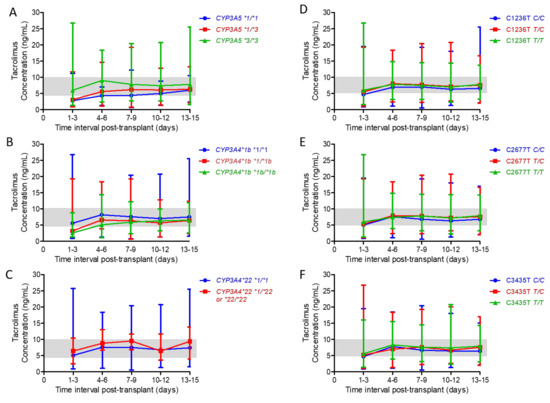Median steady-state tacrolimus trough concentrations during the first 15 days post-transplant for CYP3A4/5 and ABCB1 SNPs. Associations between steady-state tacrolimus trough concentrations measured in 3-day intervals and CYP3A4/5 (A–C) and ABCB1 (D–F) SNPs were evaluated. The x-axis denotes time in 3-day intervals for the first 15 days post-transplant while the y-axis represents the median tacrolimus trough concentrations. The shaded area represents the goal tacrolimus trough concentration (5–10 ng/mL). Abbreviations: ABCB1, ATP-binding cassette B1; CYP3A4/5, cytochrome P450 isoforms 4 and 5; SNP, single nucleotide polymorphisms.