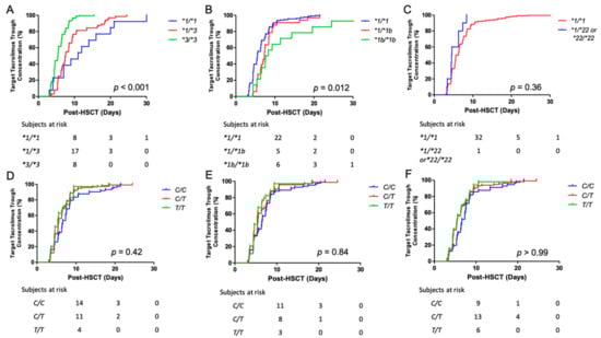 Time to target trough concentration was significantly different between CYP3A5*1/*1 and *3/*3 patients (median 11.0 vs. 5.4 days; hazard ratio [HR], 0.34; 95% confidence interval [CI] 0.22–0.53; p = 0.004), and between CYP3A5*1/*3 and *3/*3 patients (median 7.5 vs. 5.4 days; HR, 0.39; 95% CI 0.64–2.14; p < 0.001). When comparing patients with CYP3A5*1/*1 or *1/*3 to patients with CYP3A5*3/*3, time to target trough concentration was also significantly different (median 7.6 vs. 5.4 days; HR, 0.36; 95% CI 0.28–0.48; p < 0.001). However, significant differences between CYP3A5*1/*1 and *1/*3 patients were not detected (p = 0.09) (Figure 4A). Time to target trough concentration was significantly different between CYP3A4*1/*1 and *1/*1b patients (median 5.5 vs. 7.3 days; HR, 1.48; 95% CI 1.01–2.07; p = 0.02), and between CYP3A4*1/*1 and *1b/*1b patients (median 5.5 vs. 7.9 days; HR, 2.05; 95% CI 1.33–3.16; p = 0.001). However, significant differences between CYP3A4*1/*1b and *1b/*1b patients were not detected (p = 0.08) (Figure 4B). Significant differences between CYP3A4*1/*1 and patients who harbored at least one CYP3A4*22 allele were also not detected (p = 0.06) (Figure 4C). Finally, for the three ABCB1 variants, significant differences were not observed (p > 0.05) (Figure 4D–F).