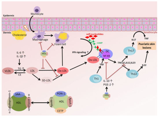 Patients with psoriasis are at a high risk for the incidence of cardiovascular disease and myocardial infarction [51]. Compared with the general population, the risk factors for cardiovascular diseases in patients with psoriasis have a high incidence, such as diabetes, hypertension, obesity, and hyperlipidemia [51]. Psoriasis is highly correlated with cardiovascular diseases, and hyperlipidemia-induced atherosclerosis is the predominant disease [1]. A large amount of evidence indicates that psoriasis is related to severe atherosclerosis and cardiovascular diseases while inflammation plays an important role in psoriasis and atherosclerosis [1]. Atherosclerosis and psoriasis have very similar immune response profiles. In addition, atherosclerosis and psoriasis share the same immunological pathways (including DCs, Th1 cells, Th17 cells, and Tregs) as well as angiogenic factors and oxidative mechanisms [2]. A number of studies show that patients with psoriasis exhibit decreased HDL levels and/or increased low-density lipoprotein (LDL), very-low-density lipoprotein (VLDL), and triglyceride (TG) levels [3].