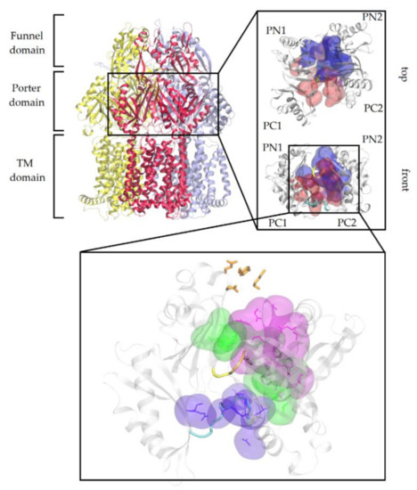 - Fischer, N.; Kandt, C. Porter domain opening and closing motions in the multi-drug efflux transporter AcrB. Biochim. Biophys. Acta 2013, 1828, 632–641. [Google Scholar] [CrossRef] [PubMed]