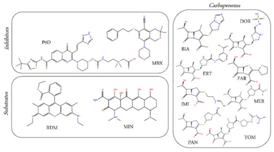 Along these lines, we report here a comparative computational investigation of the interactions between selected carbapenem antibiotics, such as biapenem (BIA), doripenem (DOR), ertapenem (ERT), faropenem (FAR), imipenem (IMI), meropenem (MER), panipenem (PAN), and tomopenem (TOM) (Figure 2), and the DPT of AcrB. Half of the selected carbapenems (namely DOR, ERT, IMI, and MER) are currently in clinical use. As a reference, two efflux pump inhibitors (MBX3132 and D13-9001, hereafter MBX and P9D respectively) and two known substrates of AcrB (rhodamine-6G and minocycline, hereafter RDM and MIN) was investigated with the same computational protocol adopted for carbapenems (Figure 2).