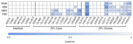 Per-residue contributions to the free-energy of binding (kcal/mol) evaluated for the considered substrates and inhibitors co-crystallized with AcrB. Only residues contributing more than kT (~0.6 kcal/mol at 310 K) are reported. Residues of the interface, DPT cave and DPT groove are colored with different tones of blue according to their individual contribution to the overall ΔGb.