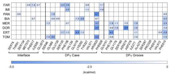Per-residue contributions to the free-energy of binding (kcal/mol) of carbapenems to AcrB. See Figure 3 for further details.