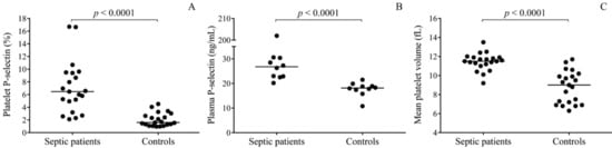 Increased level of platelet activation was detected in septic patients based on elevated surface P-selectin expression (p < 0.0001), and higher plasma concentrations of soluble P-selectin (p < 0.0001, n = 10/group) in contrast to healthy controls (Figure 1A,B). In addition, increased mean platelet volume (MPV) values (p < 0.0001) were measured in the septic cohort vs. normal controls, reflecting an increased pool of larger and younger circulating platelets (Figure 1C), which could be more reactive than smaller counterparts [24].