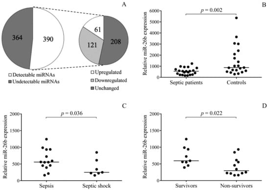 We next investigated whether changes in platelet miR-26b expression were associated with the severity of sepsis and the clinical outcome in the presence of elevated platelet P-selectin positivity. Patients were separately analyzed based on the progression of their disease, i.e., sepsis (n = 14) or septic shock (n = 7). Significantly lower levels of miR-26b were found in patients who had septic shock than sepsis (p = 0.036) (Figure 2C). When we sub-grouped septic individuals into ‘survivors’ (n = 9) and ‘non-survivors’ (n = 12) cohorts according to 28-day mortality, even lower platelet miR-26b expression (p = 0.022) was measured in early death compared to surviving patients (Figure 2D). These results suggested that there was a remarkable alteration in the expression of platelet miR-26b in connection with the severity and mortality of sepsis.