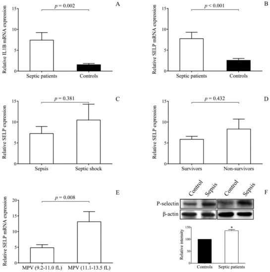 Increased SELP and P-selectin protein expression in septic platelets. Platelets of septic patients (n = 21) showed elevated levels of IL1B (A) and SELP mRNA (B) levels compared to control platelets. There was a tendency for higher platelet SELP expression in those sepsis individuals who had septic shock (C) or died by sepsis (D). In addition, significantly elevated SELP mRNA levels were observed in platelets with larger than normal MPV values (n = 8) (E). Western blot analysis of platelet lysates obtained after 72 h of sepsis onset (n = 5) demonstrated increased expression of P-selectin protein compared to normal samples (F). Mean ± SEM was depicted, * p < 0.05. Mann–Whitney U test or unpaired t-test was performed for the comparisons.