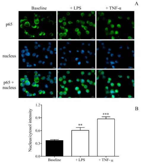 In order to confirm the cellular activation of MEG-01 cells by LPS via the nuclear factor-kappa B (NF-κB) pathway, first, the nuclear translocation of p65 was visualized by fluorescence microscopy. As a positive control, TNF-α treatment was used in the same settings. There was an enhanced nucleus/cytosol intensity for p65 after LPS or TNF-α vs. baseline (PBS) samples (Figure 4A,B).