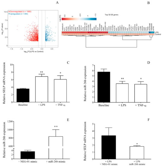 Toll-like receptor (TLR)4 pathway induced changes in mRNA and miRNA expression of MEG-01 cells. Volcano plot depicting the number of differently expressed genes in untreated and lipopolysaccharide (LPS)-treated MEG-01 cells (n = 3/condition) at 4 h, observed by RNA-seq analysis, quantified by the DESeq method and plotted based on Log10 (Fold Change) and –log (p-value). There were 354 significantly upregulated, and 1060 downregulated transcripts in LPS-activated MEG-01 cells compared to control cells at a fold change (FC) of ≥1.5. Dotted lines indicate FC cut-off (A). Clustered heat map of the top 50 differentially expressed genes in LPS-treated MEG-01 cells at 4 h. Genes were displayed as Log (Fold Change) (B). We then validated SELP expression in MEG-01 cells after LPS treatment (n = 6–8/experiment), and TNF-α stimulation was used as a positive control (C). In parallel, miR-26b was significantly attenuated by LPS or TNF-α vs. untreated cells (D). These results were in accordance with the findings in ex vivo septic platelets. The functional relationship between miR-26b and SELP expression was analyzed using specific miRNA mimic transfection in LPS-stimulated MEG-01 cell cultures. The overexpression of miR-26b by mimic (E) resulted in lowered SELP mRNA levels compared to samples with control NEG-01 mimic (F). Mean ± SEM was depicted, * p < 0.05, ** p < 0.01 based on statistical analyses.