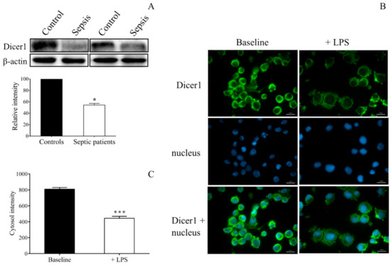 We next focused on the mechanism via mature miRNAs that were dysregulated in sepsis. Alteration of the Dicer1 level was first analyzed by Western blotting in septic vs. control platelets. There was a significantly lower Dicer1 protein level in platelet lysates of septic individuals (Figure 6A). Similarly, LPS-stimulated MEG-01 cells showed decreased protein expression of Dicer1 than control samples detected by fluorescence microscopy (Figure 6B,C).
