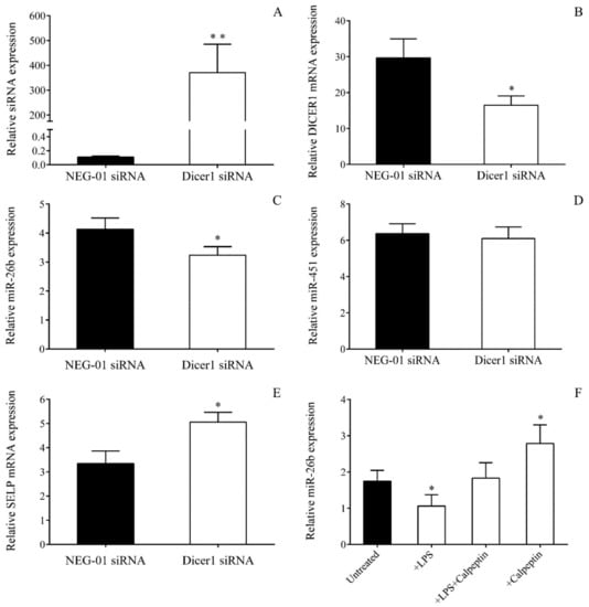 We then applied two additional approaches to further investigate the direct effect of abnormal Dicer level on miRNA in sepsis: i) by silencing of DICER1 expression using siRNA to mimic sepsis-reduced Dicer function in MEG-01 cells and ii) via specific inhibition of calpain 1 and calpain 2 with calpeptin to modulate the level of miR-26b in these cells. For this purpose, we transfected MEG-01 cells with Dicer1 specific siRNA for 24 h to downregulate DICER1 expression. The efficacy of transfection was confirmed via the quantification of the Dicer1 siRNA level, showing highly elevated expression (Figure 7A). This manipulation resulted in lowered DICER1 mRNA vs. control samples with NEG-01 siRNA (Figure 7B). As a consequence, miR-26b was significantly decreased (p < 0.05) (Figure 7C), while SELP mRNA level was upregulated (p < 0.05) (Figure 7E). In parallel, we also analyzed the expression of Dicer1-independent miR-451 to check the specificity of this intervention, and no change was seen in this miRNA (Figure 7D). To test the role of lower Dicer activity on decreased platelet miRNAs, additional experiments were performed when calpeptin inhibited the calpain function induced by increased intracellular Ca2+ concentration upon LPS or TNF-α-triggered signaling [28]. When calpain function was blocked, and the cleavage of Dicer was prevented by calpeptin in the presence of LPS (Figure 7F) or TNF-α (data not shown), the mature miR-26b level was restored in MEG-01 cells. These data supported our hypothesis that abnormal Dicer activity in sepsis could reduce miR-26b in both platelets and MKs.
