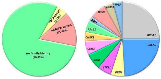 Familial and non-familial breast cancer. The diagram on the left shows the approximate fraction of breast cancer cases with no family history (green) and family history associated with (yellow) or without (brown) the occurrence of BRCA1 (DNA repair associated, breast cancer type 1 susceptibility) and BRCA12 pathogenic variants. The right diagram presents the distribution of pathogenic mutations found in breast cancer cases with family history. Abbreviations are defined in the main text.