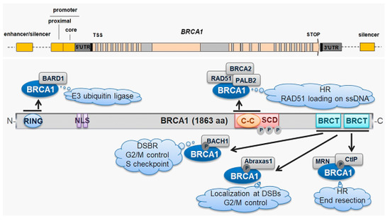 About 5% of breast cancer cases are associated with pathogenic variants of the BRCA1 (BRCA1 DNA repair associated, breast cancer type 1 susceptibility) and BRCA2 genes (Figure 1) [1]. The presence of such variants increases the lifetime risk of breast cancer by 40–90% [2]. The protein products of both genes are involved in genome protection [3]. Several genome-protective functions have been attributed to BRCA1, including transcription regulation, DNA repair, chromatin remodeling, and ubiquitin ligation [4]. BRCA1 functions as a tumor suppressor due to its role in the maintenance of genomic stability via its multiple roles in the cellular response to DNA double-strand breaks (DSBs, see next sections). That role includes its involvement in cell cycle control, chromatin remodeling, homologues recombination repair (HRR), and non-homologues end-joining (NHEJ) [4]. Although not directly proven, it is accepted that the inefficient repair or misrepair of DSBs by HRR or NHEJ may be causal for breast cancer, at least for cases that are associated with BRCA mutations (reviewed in [5]). Emerging evidence suggests that not only HRR, firstly reported to link breast cancer with BRCA mutations, but also NHEJ and especially its error-prone alternative versions, may play an important role in breast cancer pathogenesis [6]. However, the potential role of BRCA1/2 in sporadic breast cancer is not completely clear and it is hypothesized that haploinsufficiency of these two genes may be enough to initiate breast carcinogenesis or that these two genes are not involved in sporadic breast cancer [6]. Therefore, further studies are needed to link the role of BRCA1 in maintaining genomic stability with breast cancer.