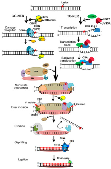 GG-NER checks the entire genome for DNA distortion, whereas TC-NER is activated by RNA polymerase II stalling at the site of distortion, but damages in the non-transcribed strand of active genes are processed by GG-NER. In GG-NER, XPC (XPC complex subunit, DNA damage recognition and repair factor, Xeroderma pigmentosum group C) forms a complex with CETN2 (centrin 2) and hRAD23B (RAD23 homolog B, nucleotide excision repair protein) (Figure 3). It recognizes and preferentially binds the site of DNA damage where base pairing is disrupted. XPC-CENT2-hRAD23 can be assisted by the DDB (damage specific DNA binding protein) complex consisting of DDB1 and DDB2. DDB is present in some lesions, particularly UV-induced cyclobutane pyrimidine dimers, but it is likely not essential for NER and helps to recognize NER substrates within the chromatin [30]. In TC-NER, DNA damage stalls RNA polymerase II that interacts with CSB (ERCC excision repair 6, chromatin remodeling factor) and the CSA (ERCC excision repair 8, CSA ubiquitin ligase complex subunit)-CSB complex. These interactions likely result in backward translocation of the complex (backtracking) and make space for other NER factors. The transcription initiation factor of RNA polymerase II H (TFIIH) is recruited after damage recognition in both GG- and TC-NER. XPG (ERCC excision repair 5, endonuclease), a single-strand-specific DNA endonuclease, is recruited to the complex, either separately or as part of TFIIH that releases CAK (cyclin dependent kinase 7). TFIIH further unwinds DNA in the vicinity of the damage that is then verified by the concerted action of XPD (ERCC excision repair 2, TFIIH core complex helicase subunit), XPB (ERCC excision repair 3, TFIIH core complex helicase subunit), and XPA (DNA damage recognition and repair factor). XPA strongly binds to chemically altered nucleotides in a single DNA strand. The other, undamaged strand is coated by replication protein A (RPA). XPA recruits the XPF (ERCC excision repair 4, endonuclease catalytic subunit)-ERCC1 (ERCC excision repair 1, endonuclease non-catalytic subunit) that makes a cut on the damaged strand 5′ to extract the damage. Then, a 3′ cut is made by XPG that results in the excision of a single-stranded fragment of DNA containing the damage. A PCNA (proliferating cell nuclear antigen) ring-shaped trimer is loaded onto DNA recruiting DNA polymerase δ or ε to synthesize new DNA to fulfill the gap, and DNA ligase 1 or 3 catalyzes the formation of a phosphodiester bond to seal the DNA.