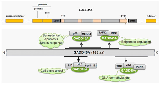 GADD45A plays several important functions in the cell, including cell growth suppression; mediating cell cycle arrest at G2/M; apoptosis induction; and interaction with p53, CDK1 (cyclin dependent kinase 1, Cdc2), and cyclin B1 (Figure 4, reviewed in [99]). These functions underline an important role of GADD45A in maintaining genomic stability, DDR, and cancer transformation. In fact, the protective role of GADD45A in DNA damage-induced tumorigenesis is a main biological function of this protein that has been demonstrated so far [100,101,102]. However, molecular pathways underlying this protective role of GADD45A in cancer are not completely known.