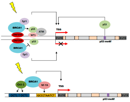 Several works have shown that BRCA1 strongly activates GADD45 in a p53-independent fashion [113]. The normal transactivation activity of BRCA1 is required to activate GADD45, as tumor-derived mutants of BRCA1 did not do so [114]. However, the exact mechanism of BRCA1-induced activation of GADD45A may be complex as at least three sequence motifs in the GADD45A may play a role in this effect. These are as follows: a BRCA1 binding site located in the first intron of the gene, a ZBRK1 (Zinc finger and BRCA1 interacting protein with a KRAB domain 1) binding site in the third intron, and OCT1 and CCAAT-box elements located between −121 and −75 in the promoter region [113,114,115]. Moreover, BRCA1 associates with transcription factors Oct-1 and NFYA (nuclear transcription factor Y subunit alpha) that bind the OCT1 and CAAT motifs [69].