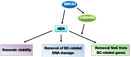 In summary, NER may play a multifaceted role in breast carcinogenesis, but further research is required to clarify this. At present, its role may be summarized as (I) the maintenance of genomic stability, (II) removal of breast cancer-causal DNA damages, and (III) BRCA1- and GADD45-mediated demethylation of breast cancer-related genes.