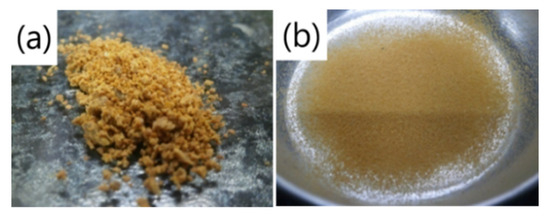 Chitosan–mangostin–alginate dry particles: (a) before grinding and (b) after grinding with particle size < 100 µm.