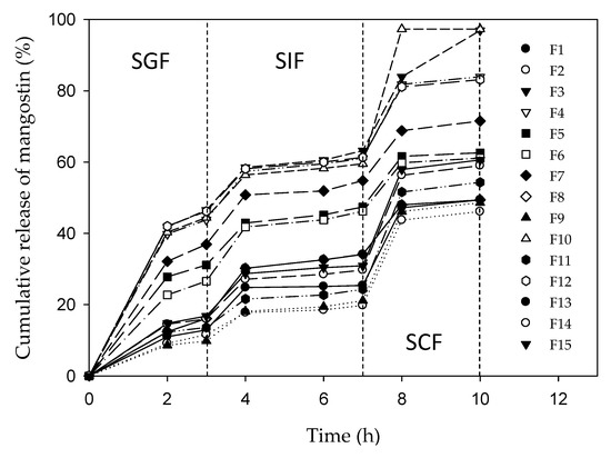 Figure 1 shows the chitosan–alginate microparticles optimized for colon-targeted release of mangostins based on the surface response method with Box-Behnken design. Figure 2 shows the experimental cumulative release of mangostins from the chitosan–alginate microparticles immersed sequentially in simulated gastric fluid (SGF) (3 h), simulated intestinal fluid (SIF) (4 h), and simulated colonic fluid (SCF) (3 h).