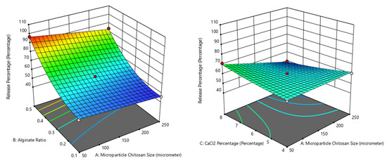 where A is the size of the chitosan–mangostin microparticles, B is the alginate:chitosan mass ratio, and C is the CaCl2 concentration. Table 3 shows the p-values of the analysis of variance (ANOVA) that represent the significance of the model and each of the independent variables, as determined using the Design-Expert software. A p-value > 0.0001 indicates that the variable has no significant effect on the response.
