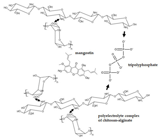 Illustration of the ionically crosslinked chitosan–tripolyphosphate gel (single arrow) and chitosan–alginate polyelectrolyte complex (double arrow) in the chitosan–alginate microparticles.