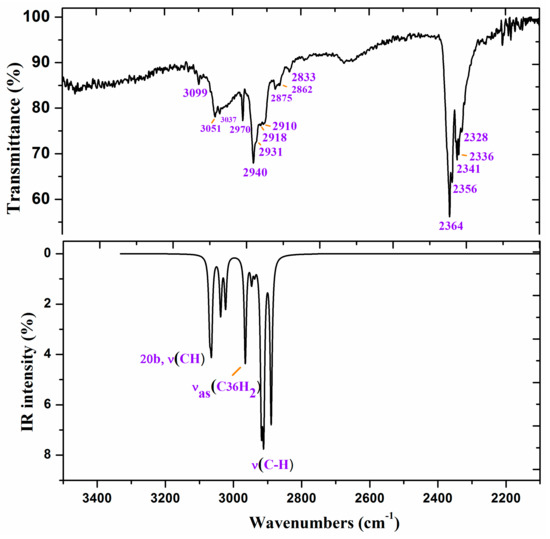 | 3040.9 | 46 | 4 | 1.1 | 5.92 | 2902 | 2910 w | 100%, ν(C–H) |
